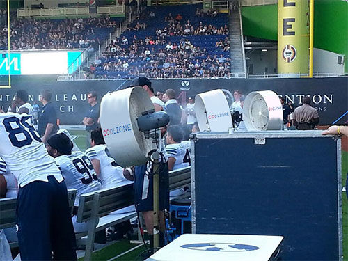 On the field or in the pits, Cool Zone⢠is in play. Cool Zone has been the choice of a variety of venues including the Super Bowl, NASCAR and the World Cup. Our systems have also been used for football, NASCAR, special events, other athletic applications, motor sports and more. Cool Zone Misting Fans keep personnel along with sophisticated machinery cool, without wetness build-up. Cool Zone is the leading supplier and/or manufacturer of high-pressure misting fans. Cool Zone offers a wide selection of high-pressure misting fans to meet any high end residential, commercial or industrial applications. Cool Zone supplies both portable misting fans along with a full line of wall mounted misting fans. Click the button below to view our product line and/or please call with any questions.